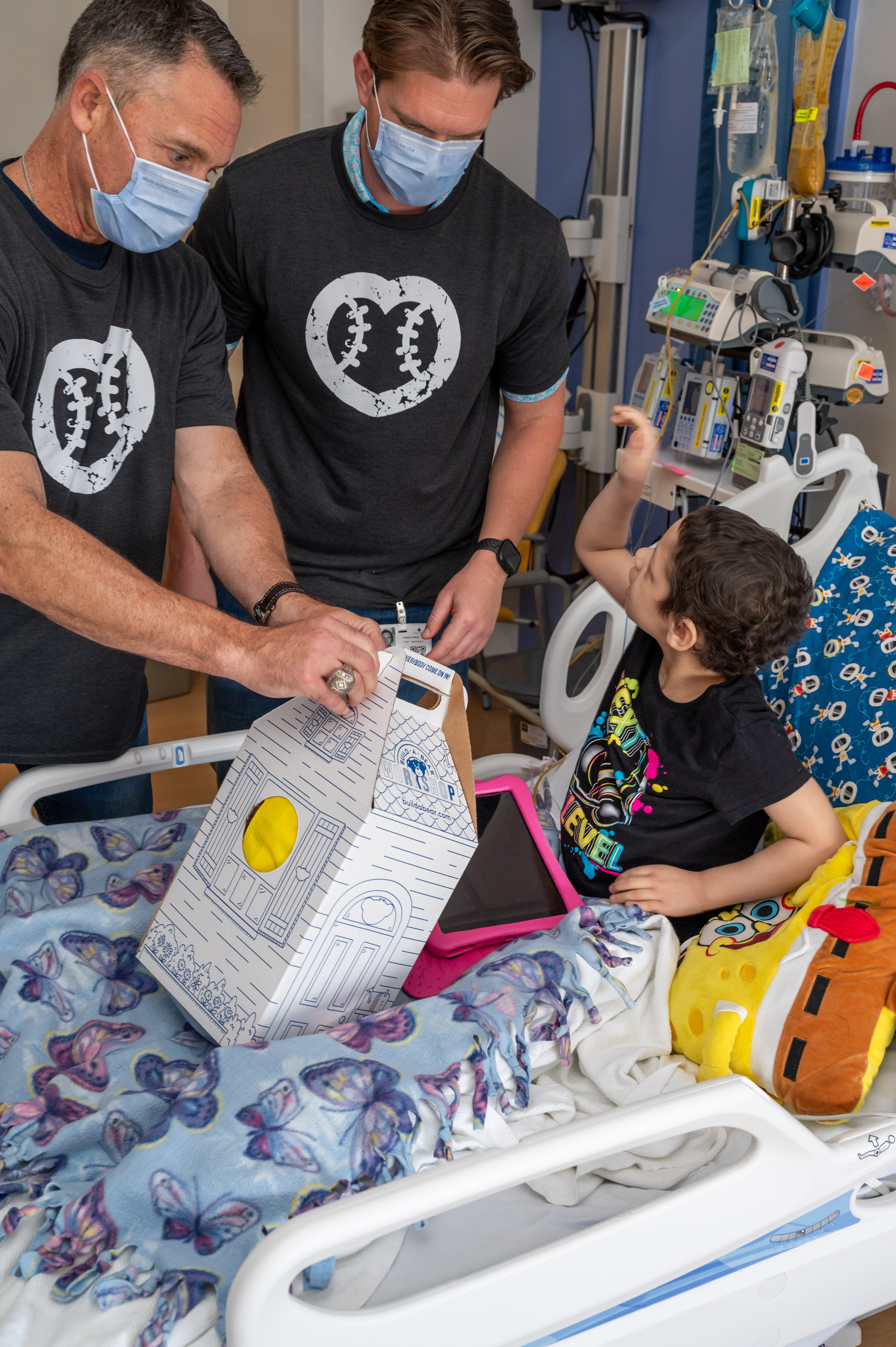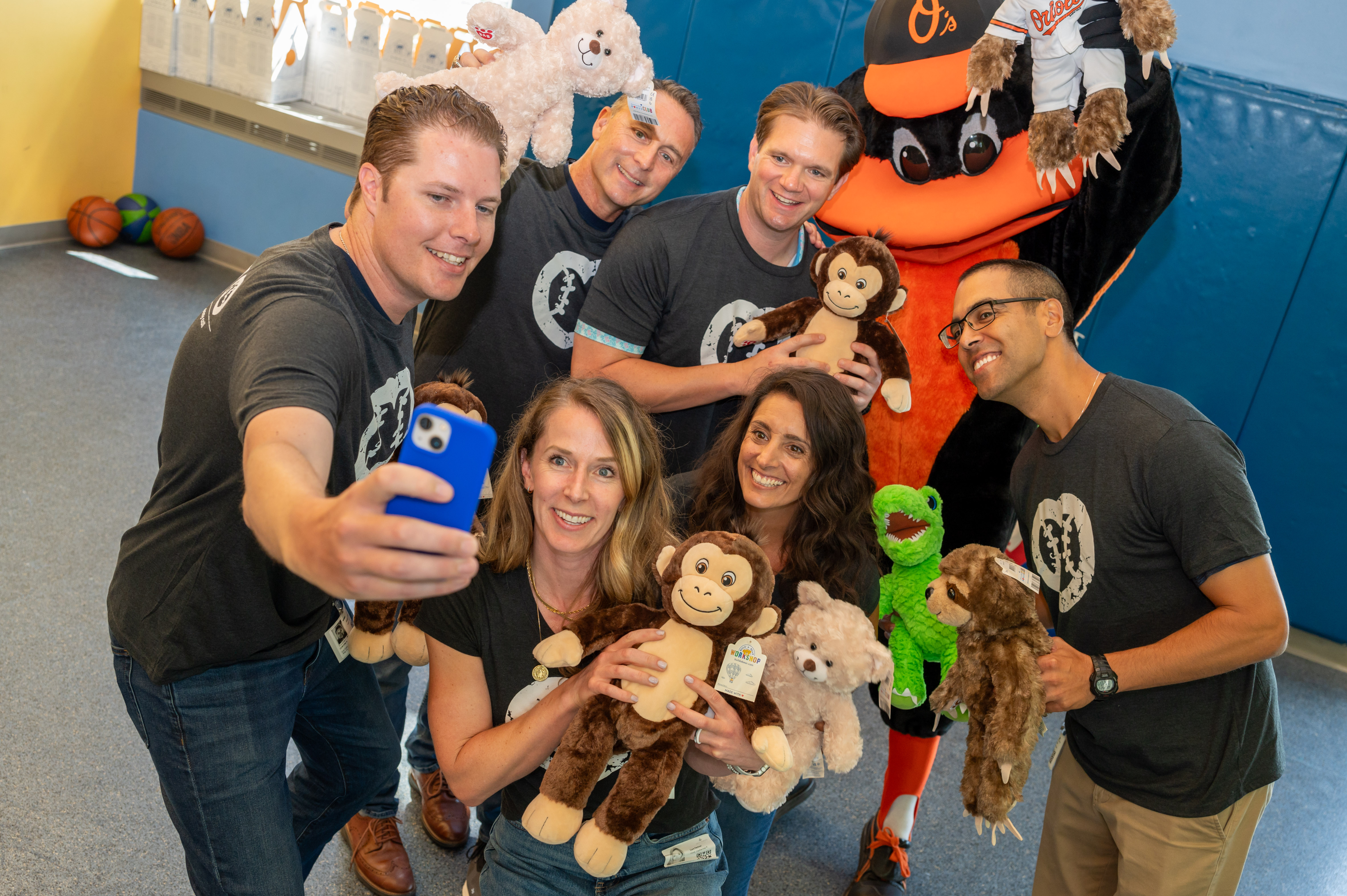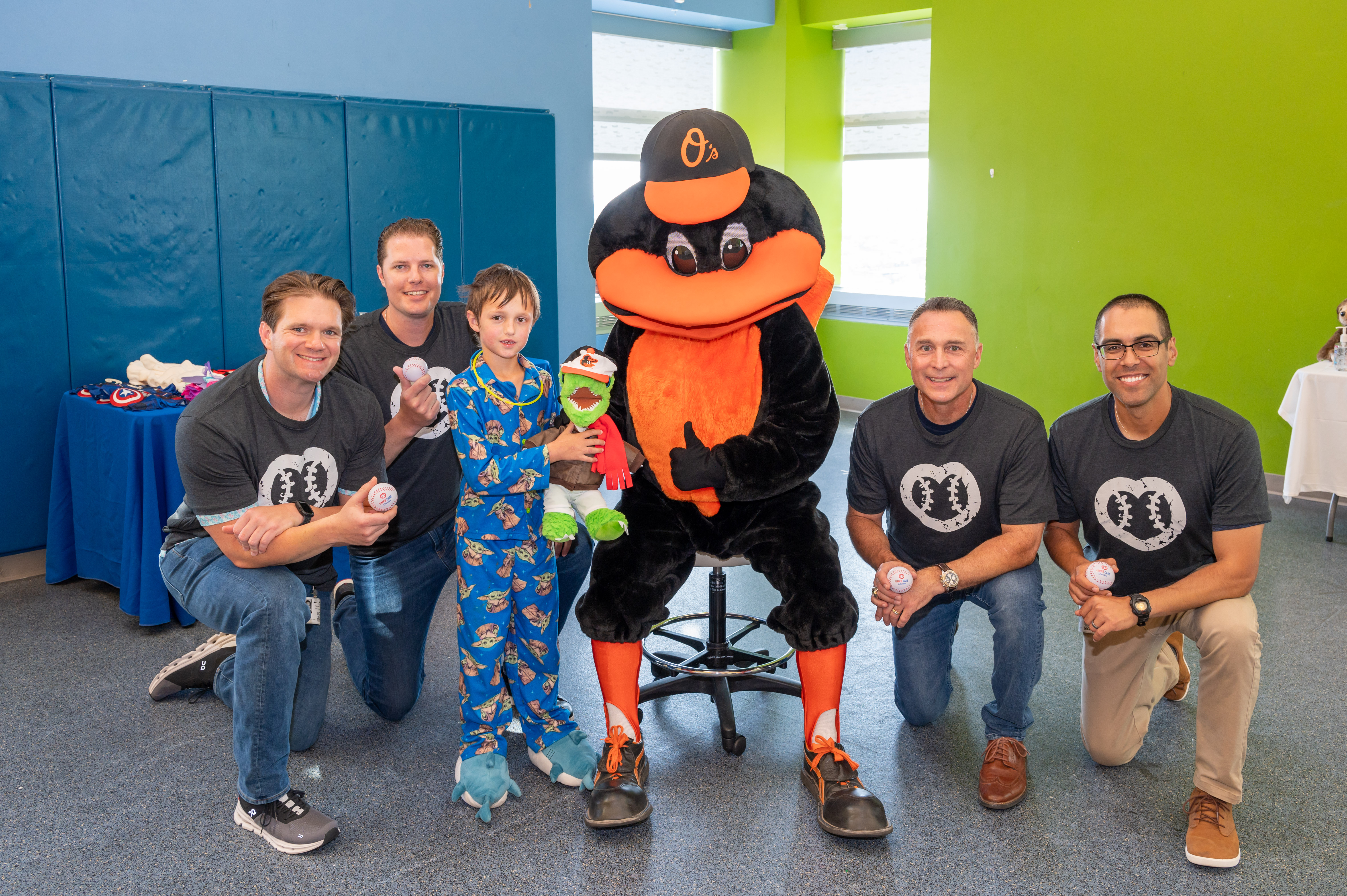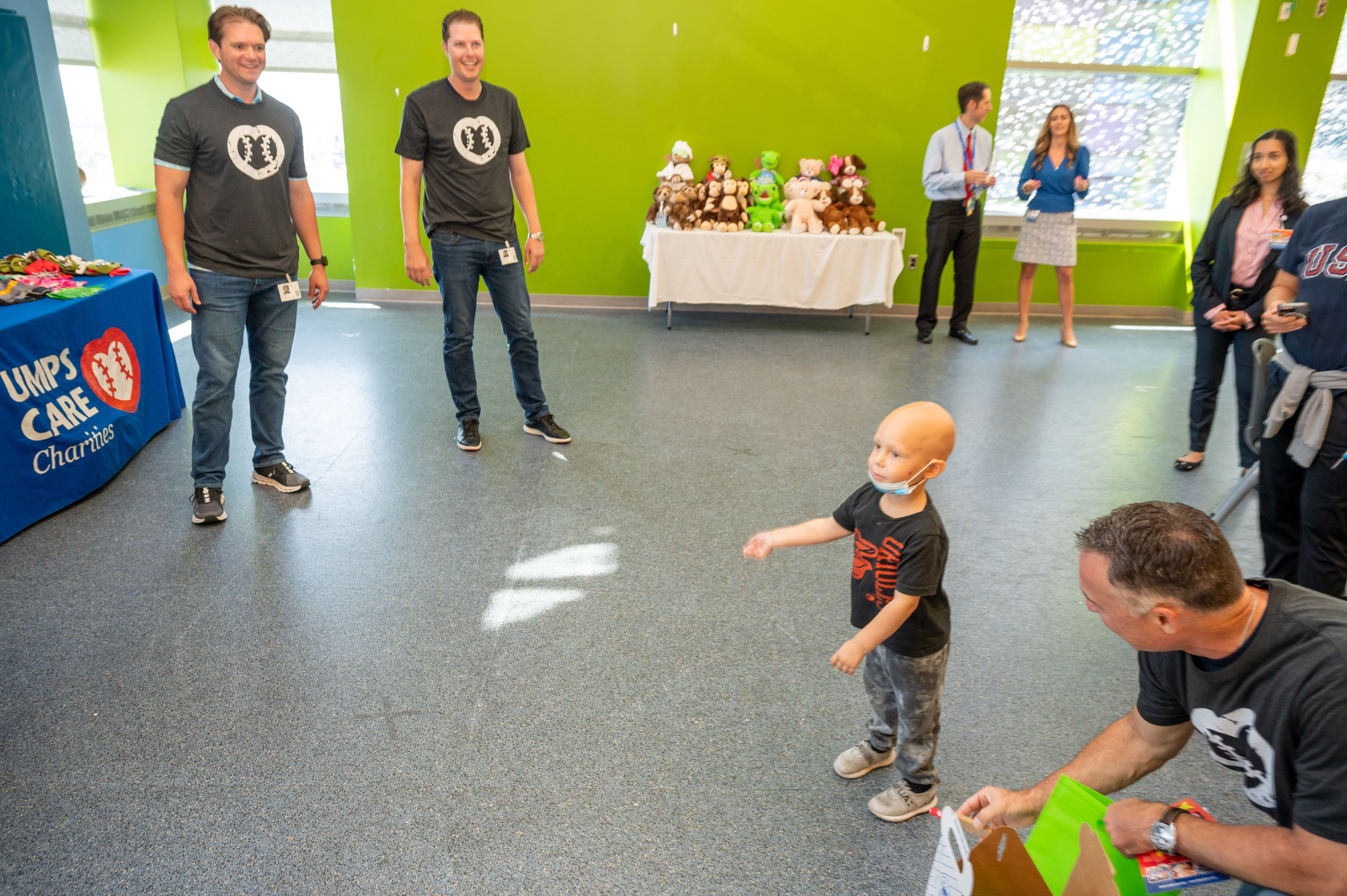 (L to R) Umpires Dan Iassogna, Adam Beck, Clint Vondrak and Gabe Morales bring Build-A-Bear joy to a patient at Johns Hopkins Children’s Center.