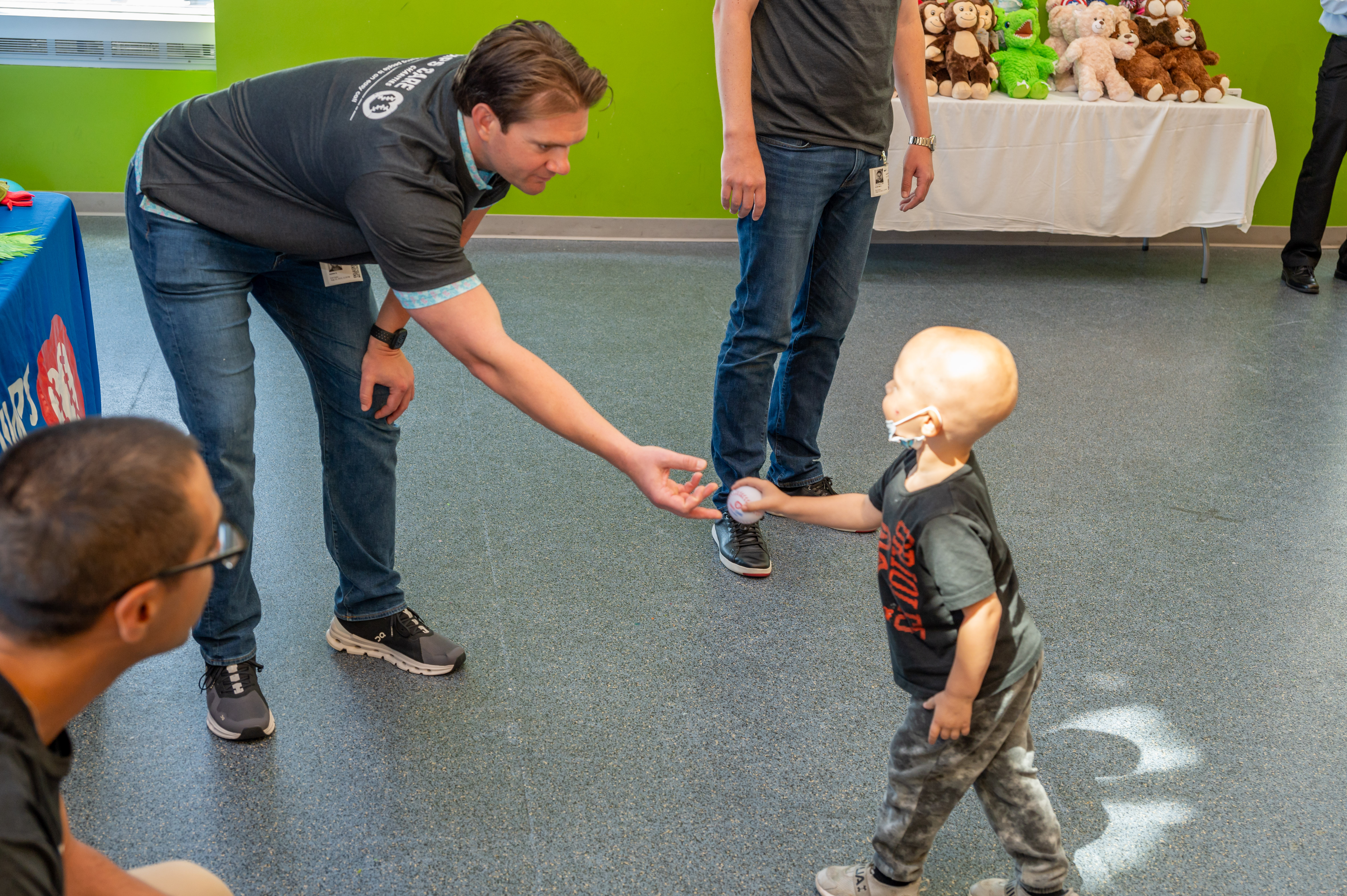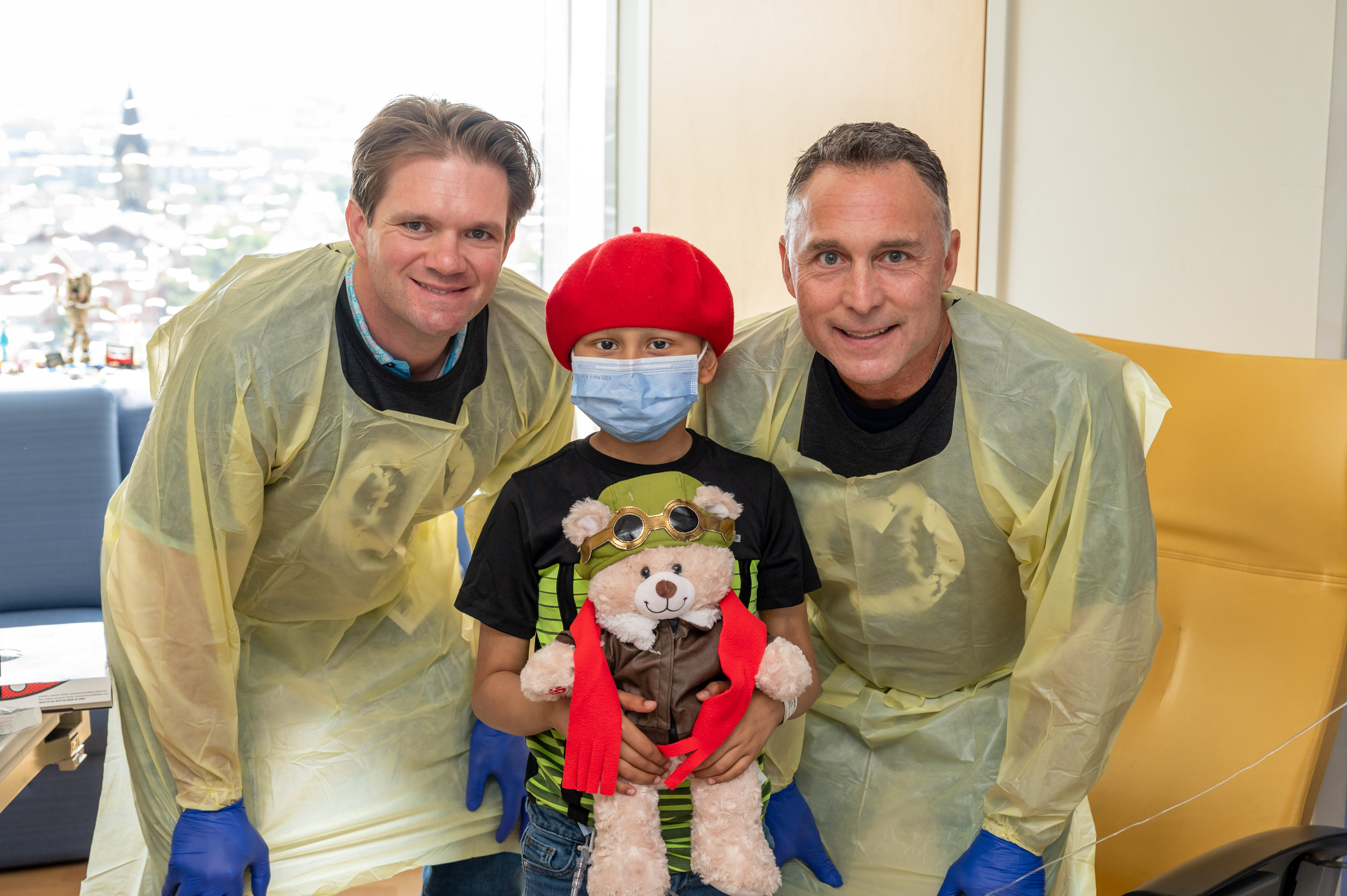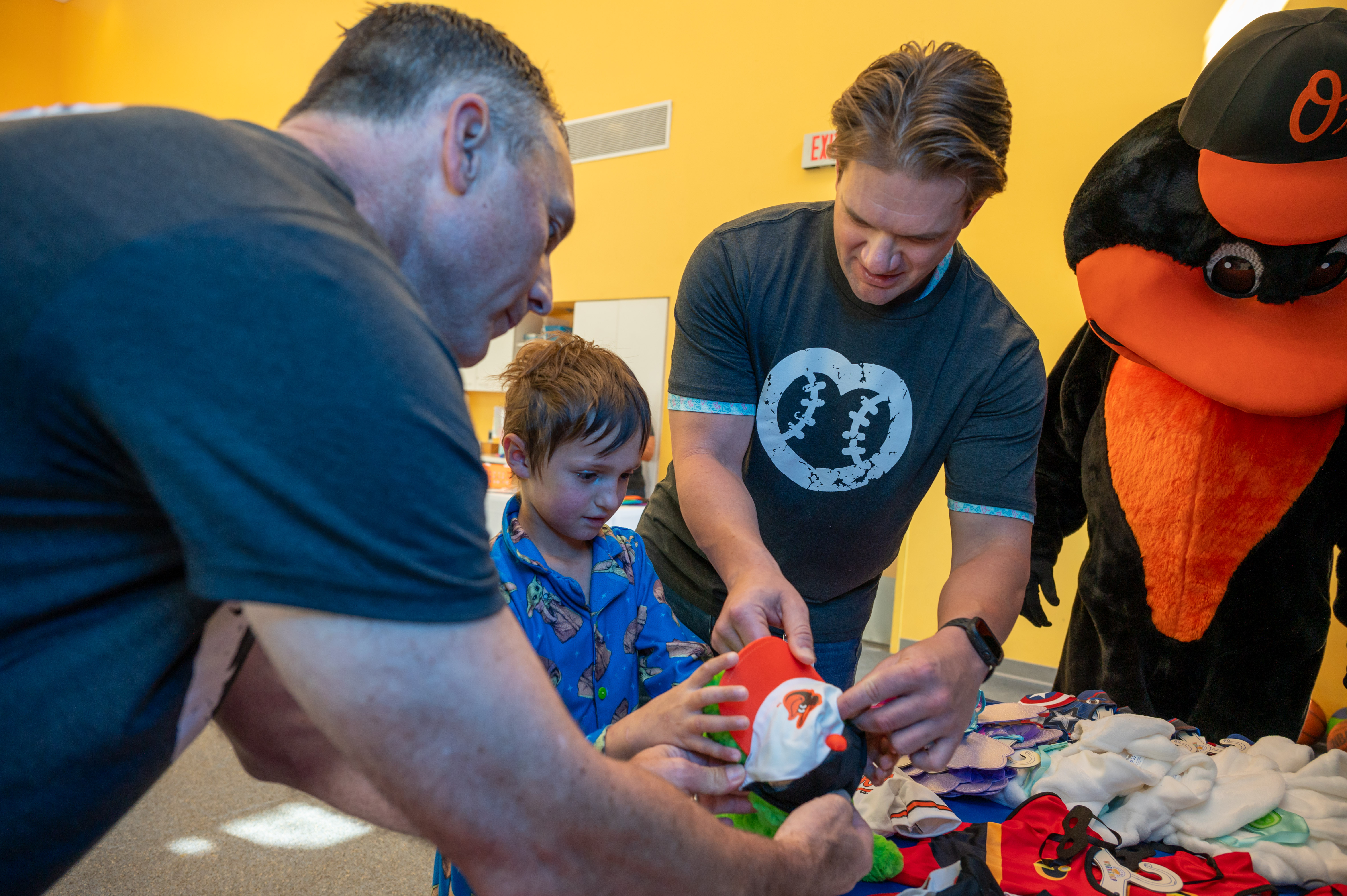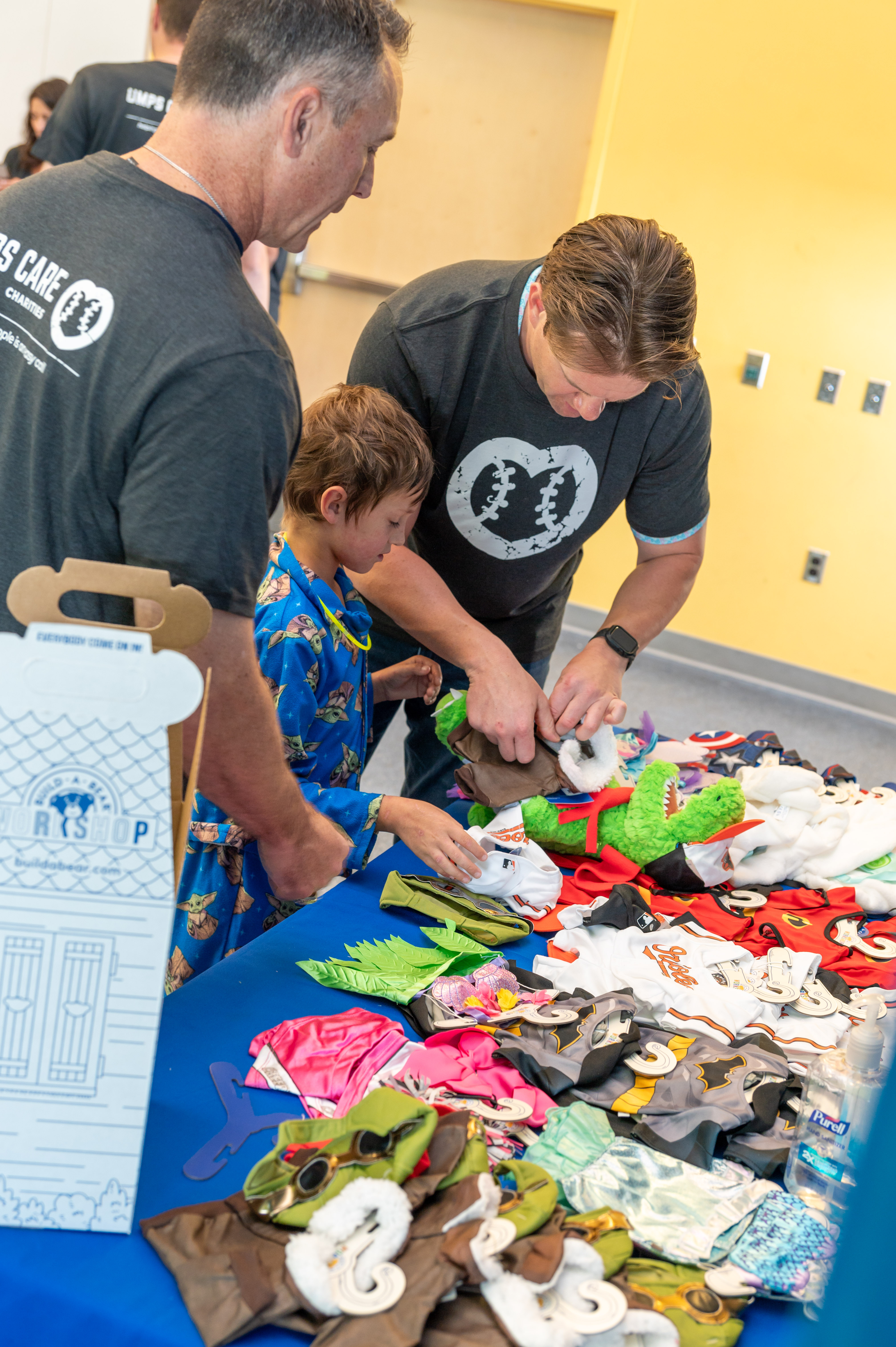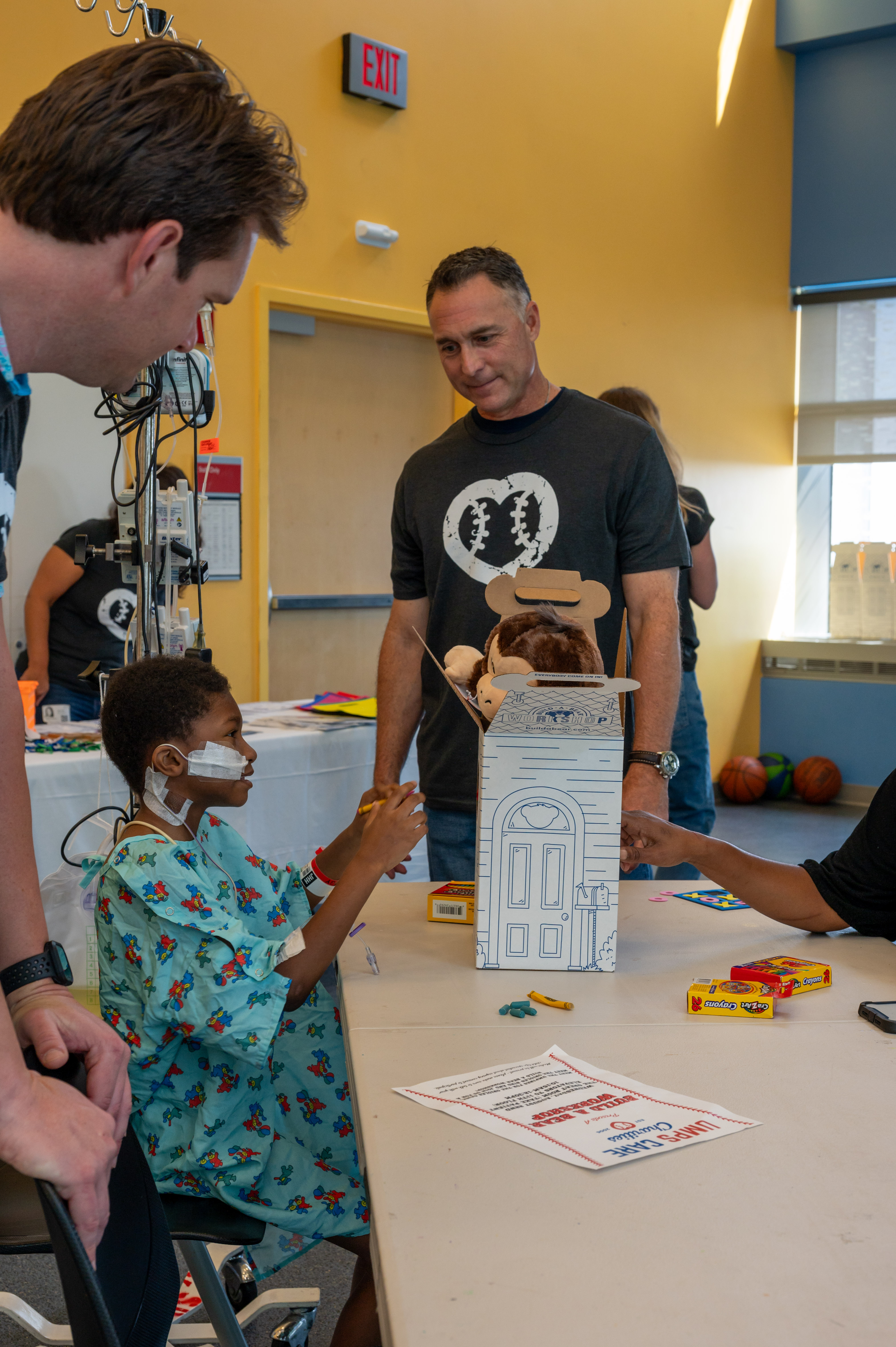 (L to R) Umpires Dan Iassogna, Adam Beck, Clint Vondrak and Gabe Morales bring Build-A-Bear joy to a patient at Johns Hopkins Children’s Center.