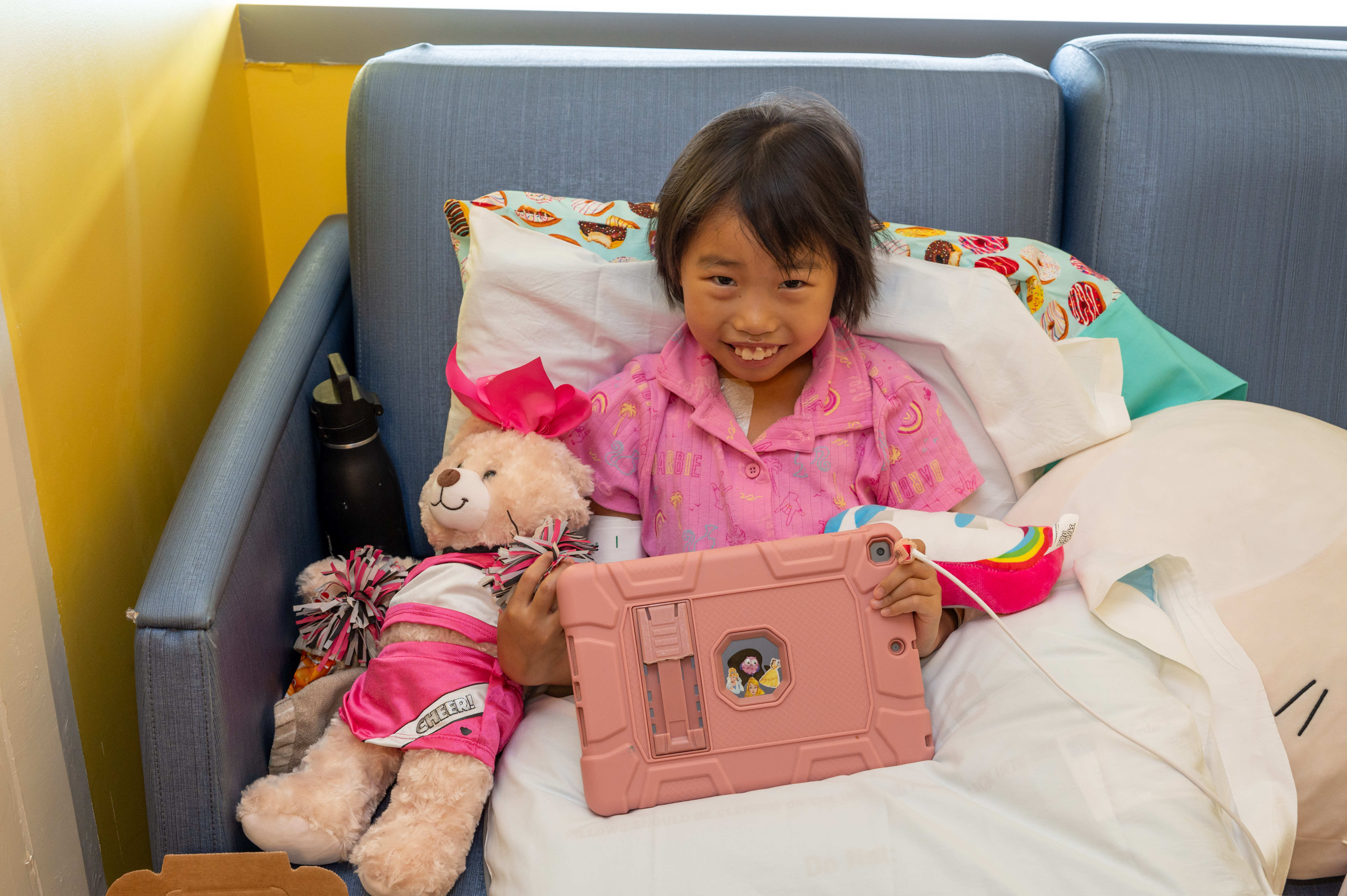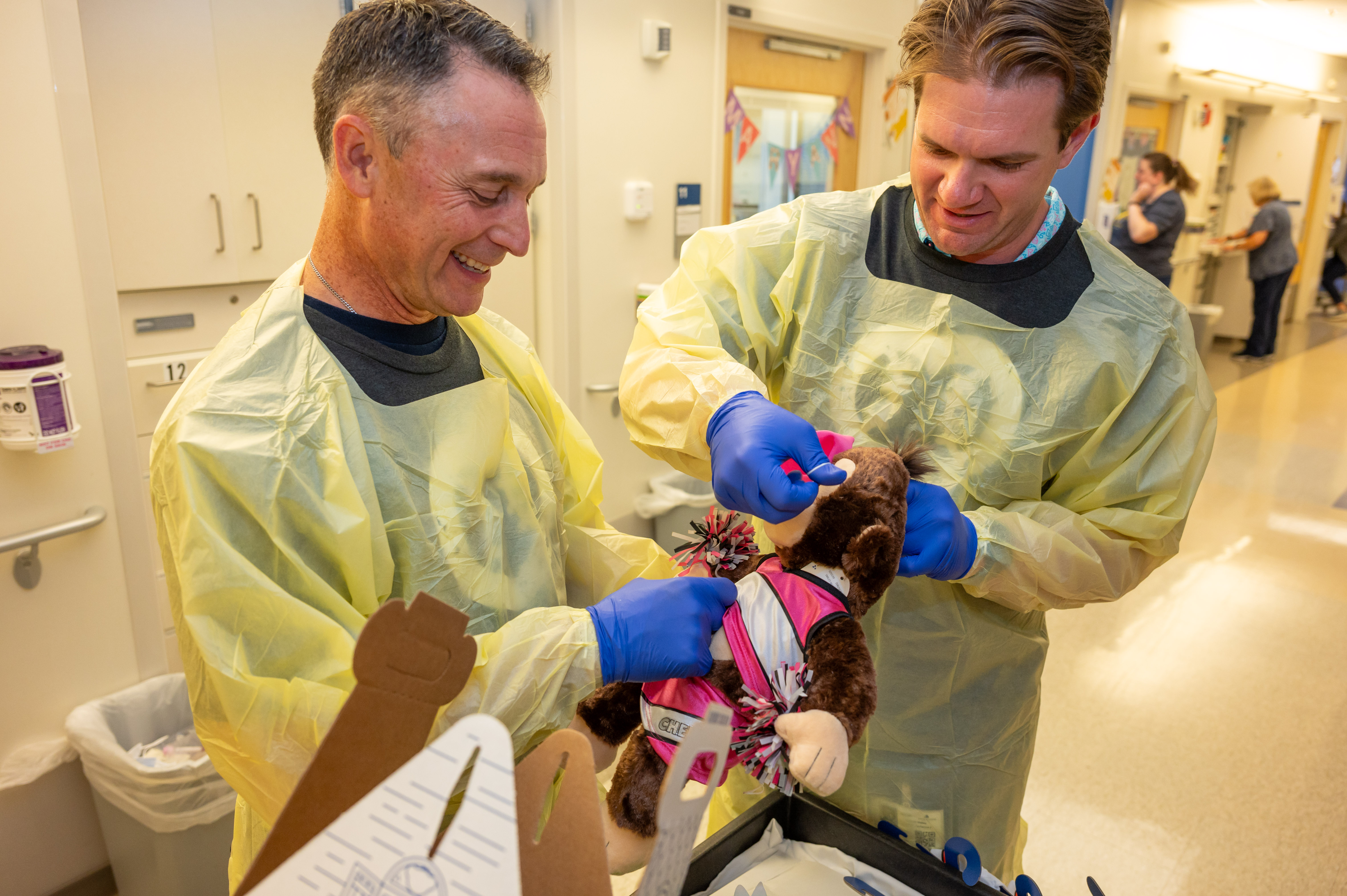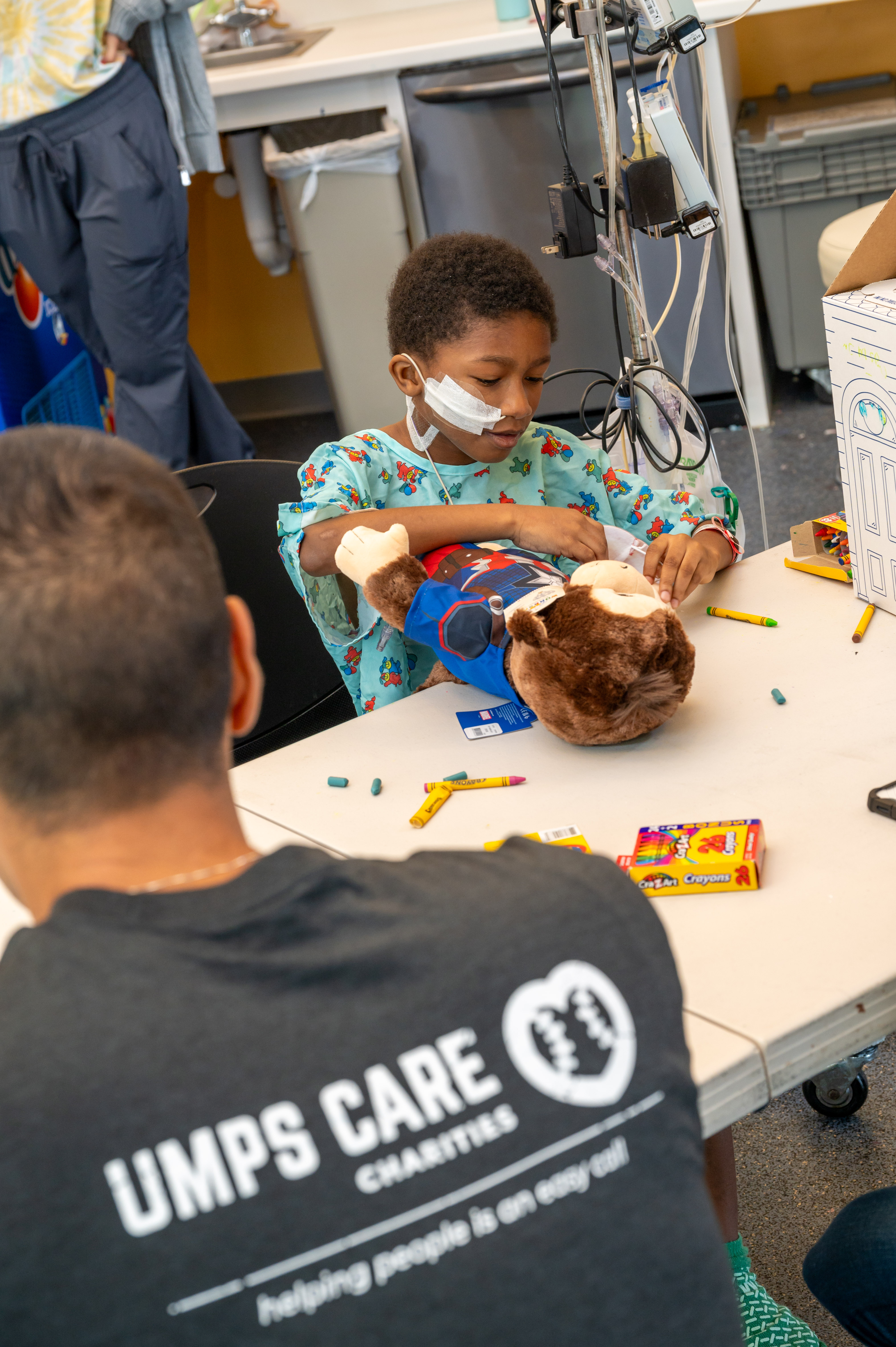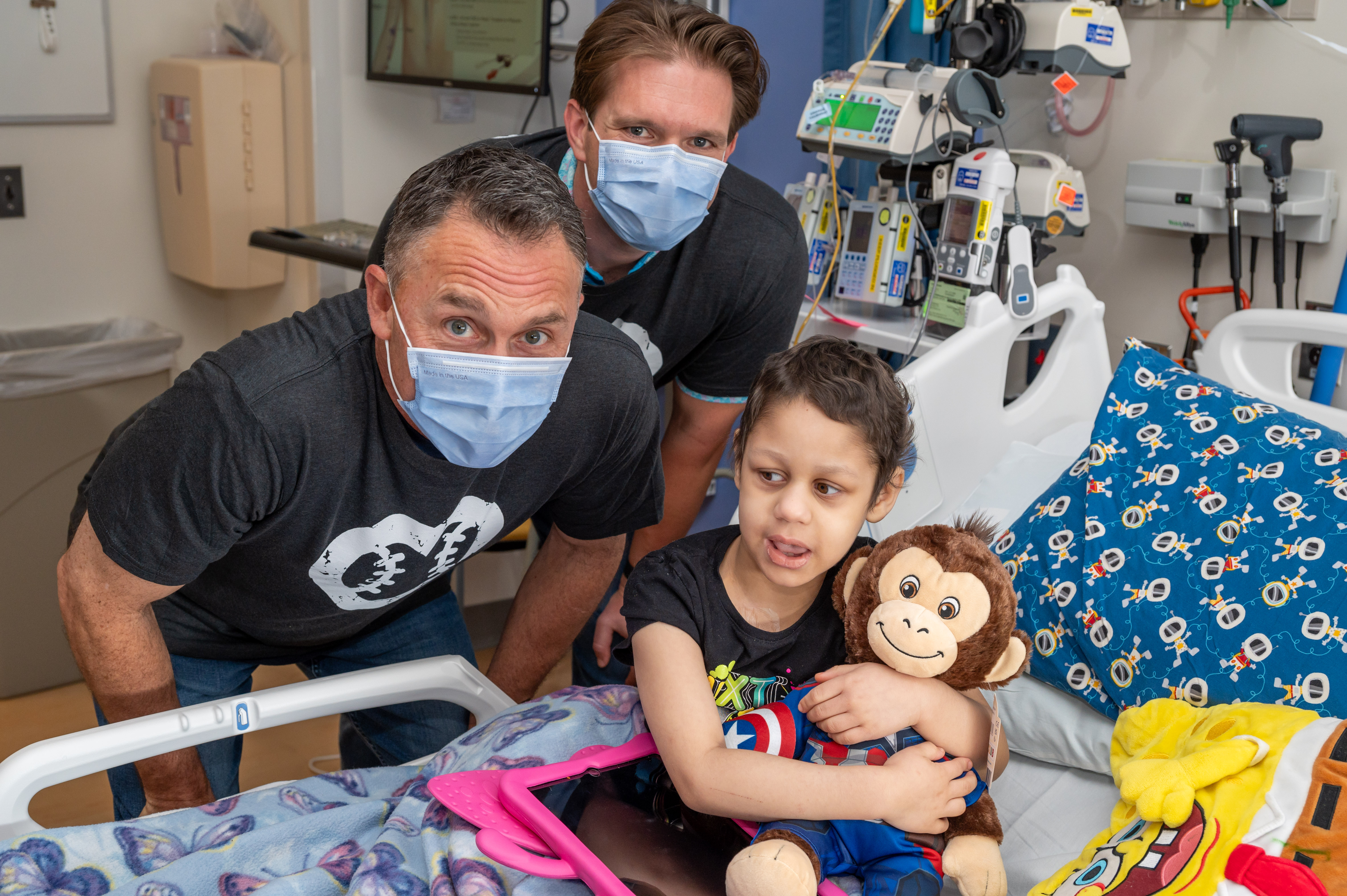 (L to R) Umpires Dan Iassogna, Adam Beck, Clint Vondrak and Gabe Morales bring Build-A-Bear joy to a patient at Johns Hopkins Children’s Center.